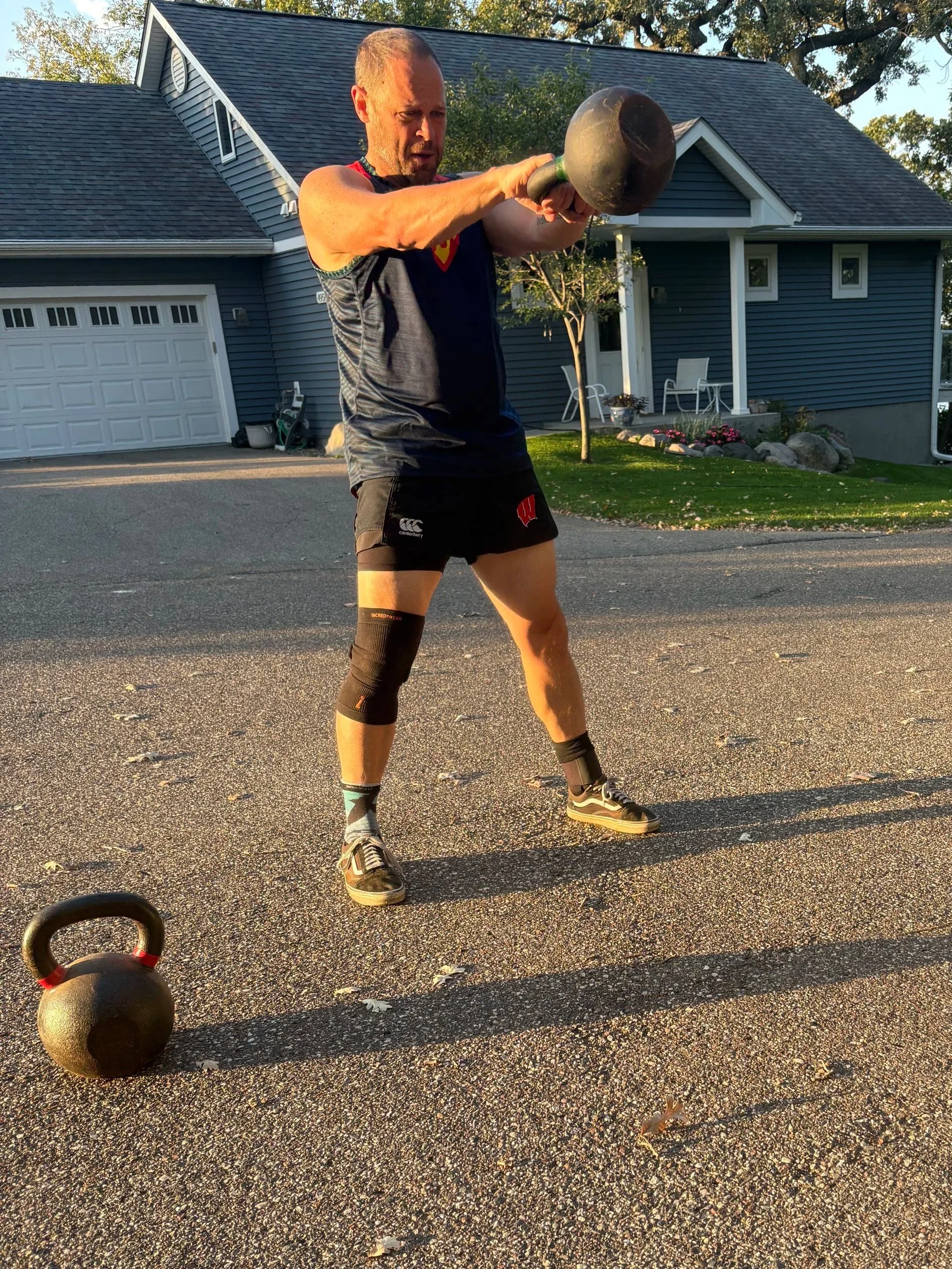 Coach Ryan McDowell performing kettlebell swings outdoors